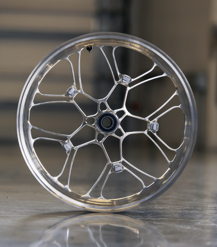 This groundbreaking wheel sets a new benchmark in motorcycle design and engineering. Weighing as little as 8 lbs 5 oz, the new monolithic wheel is lighter and more rigid than anything previously available on the market. It features a boltless front-wheel design, made possible by Lyndall’s patented Lug-Drive attachment system, eliminating the need for traditional hardware and reducing potential points of failure.
