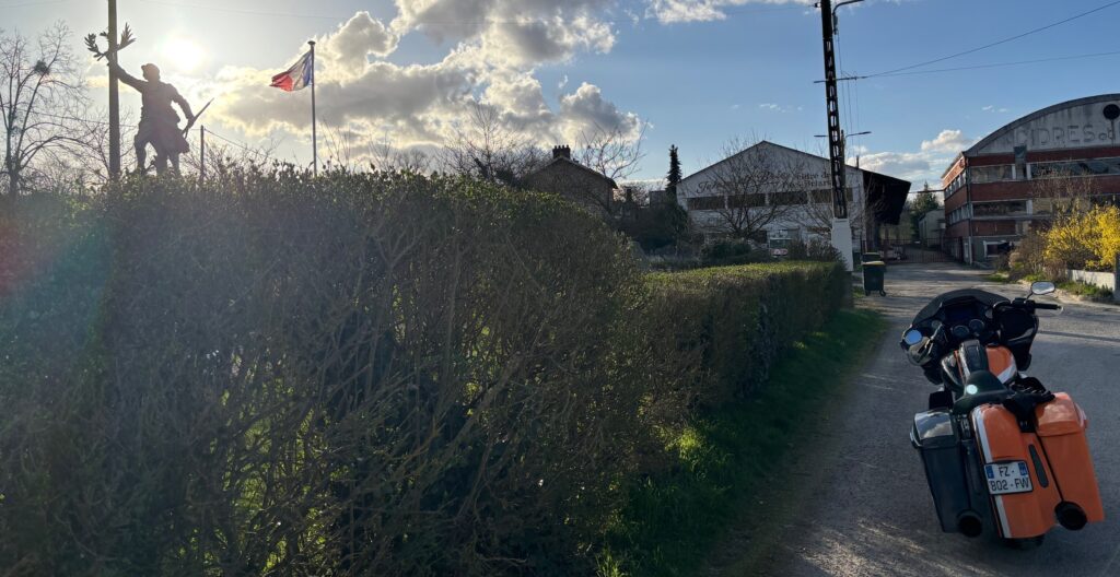 One last stop awaited me before returning home. I absolutely wanted to stop in the small village of BELLOT where there is a very pretty war memorial that has been colored after first World War. I hadn’t stopped here for years and I remembered the pretty colors of this sculpture. The last time I came here, I was riding my beloved gray club style Fat Bob.