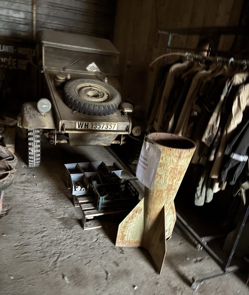 In particular, hiden deep in the workshop, a german Volkswagen Type 82 Kübelwage waiting for its turn to be restored.  This Kübelwagen or simply Kübel, contractions of the original German word Kübelsitzwagen (translated: ‘bucket-seat car’ — but when the contractions are translated literally a back-formation of ‘bucket’ or ‘tub’-car results), is a military light utility vehicle designed by Ferdiand Porsche himself and built by Volkswagen during WWII for use by the Nazi German military (both Wehrmacht and Waffen SS). Based heavily on the Volkswagen Beetle, it was prototyped and first deployed in Poland as the Type 62, but following improvements entered full-scale production as the Type 82